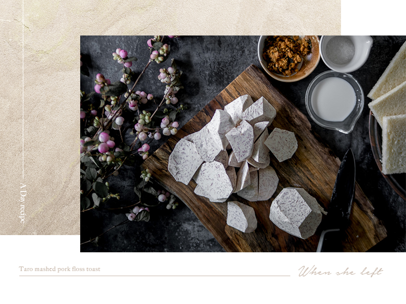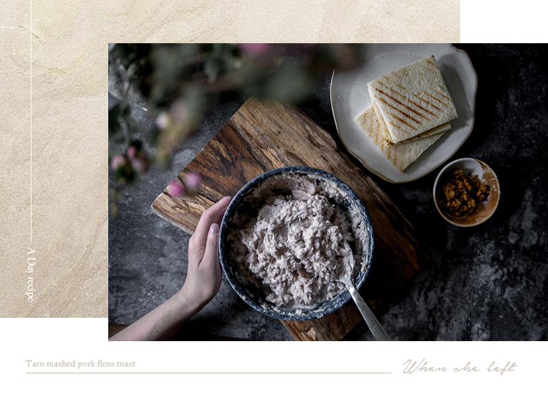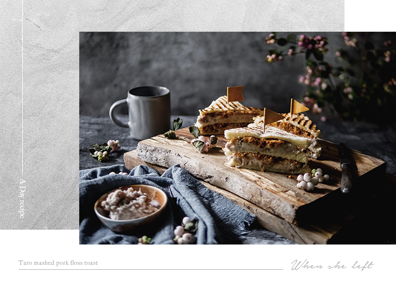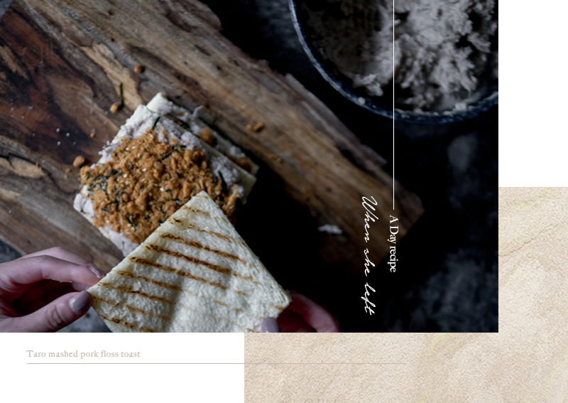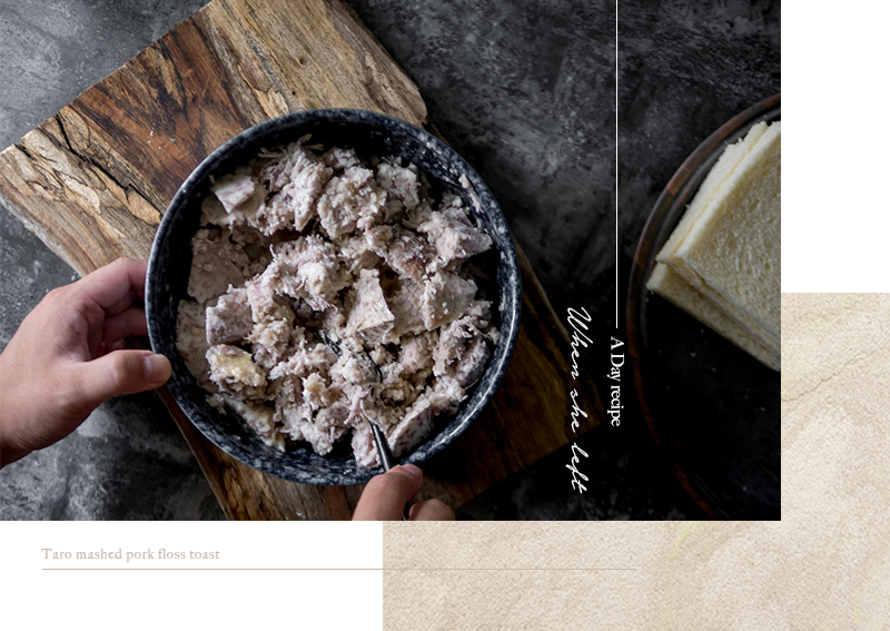 4.吐司烤过之后抹上一层厚厚的芋泥再撒上肉松叠好即完成