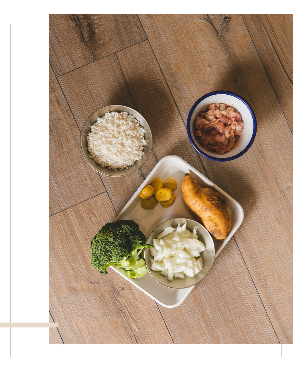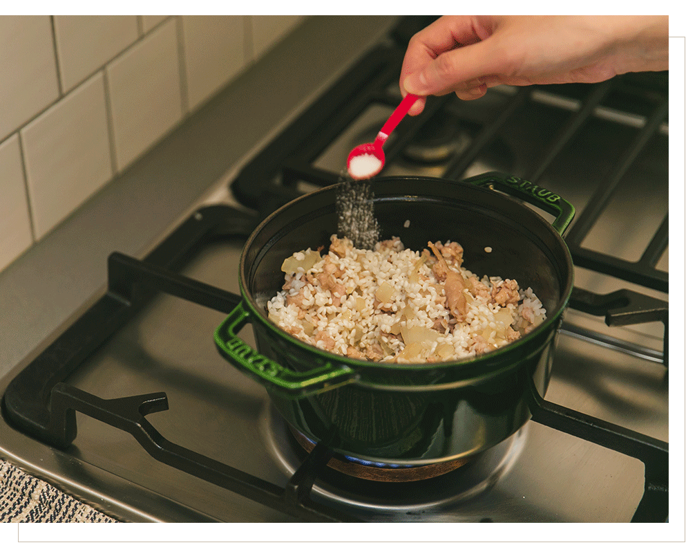 3. 加入米、地瓜、盐、味醂及1. 1 杯的水,搅拌均匀后,在上面铺上栗子。