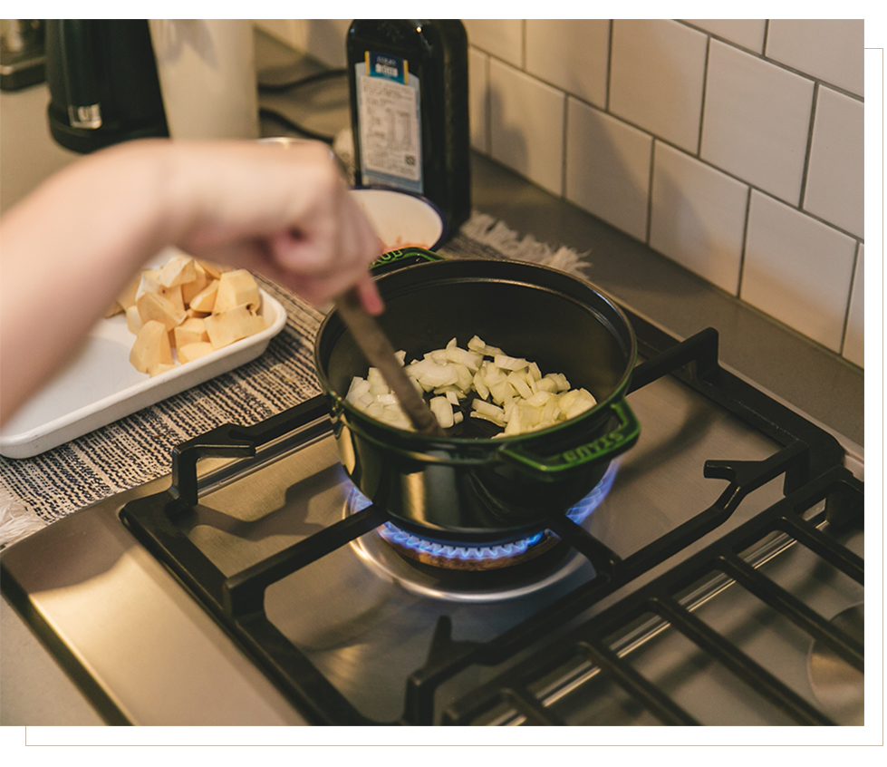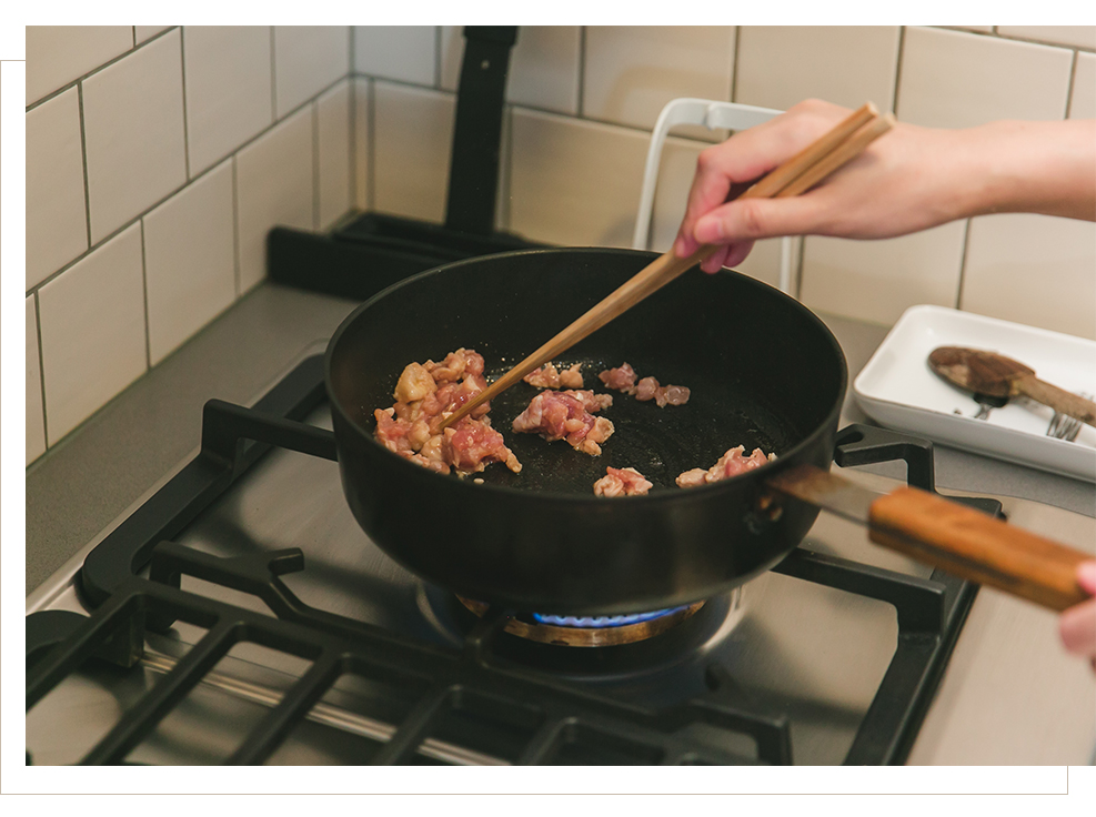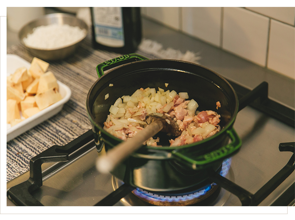 1. 以少许油热锅后,加入洋葱丁炒至香气出来,并且带点透明感。