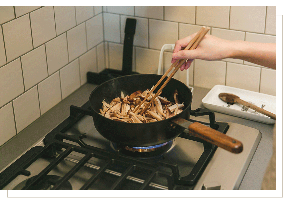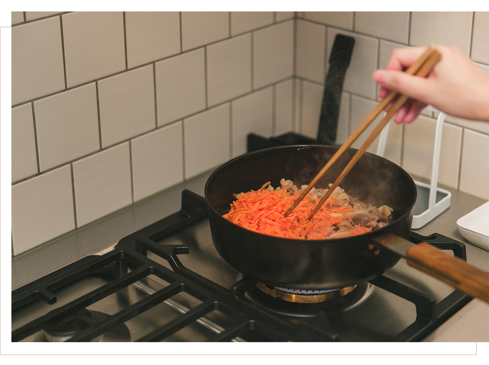 3.将炒香菇的水倒掉后,加入红萝卜拌炒至变软。