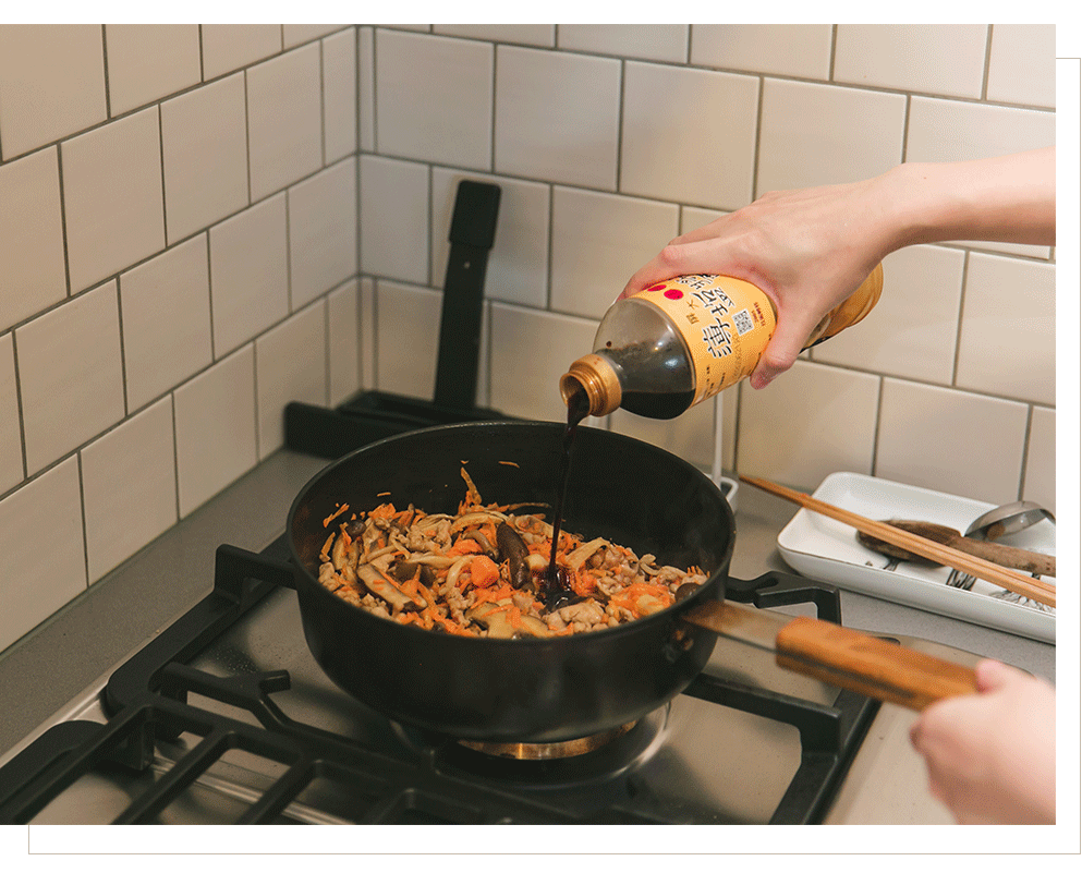 4.食材以酱油、味醂调味后,将白饭放入,搅拌均匀,最后加入少许烹大师即完成。