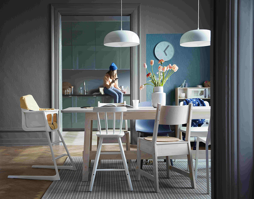 首先,要有计划地搭配餐椅。一般家里餐桌以4-6人的聚餐人数设置,而平时家里可能只有2-4人用餐,如果家中吃饭的人较多,而餐厅空间又不大,可以选一些可折叠,或者叠摞式椅子,占地少、好收纳,又方便使用。