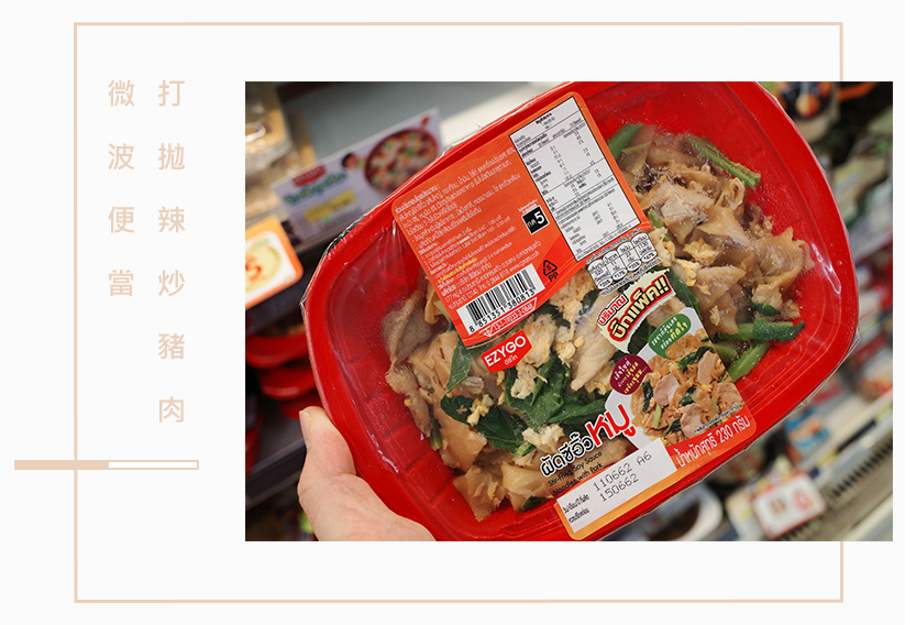 除了热压吐司,在冷藏柜内的各种微波便当口味都不错,CP 值高非常值得推荐,其中又以泰国国民美食之称的打抛辣炒猪肉末便当最受欢迎,打抛叶Krapow 是一种泰国的香叶,佐以蒜末、辣椒和猪肉末等猛火快炒,就成了泰国人最爱的下饭料理,不知道吃什么时当地人基本上都会点这道解决一餐,有机会可以尝尝便利店内的少辣版本。